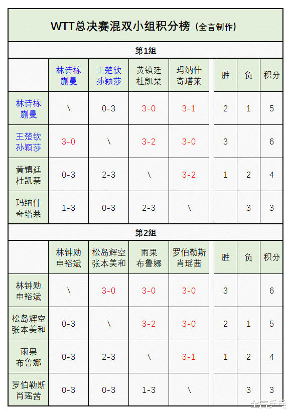 本届总决赛自12月10日开打,当今还是进渡过半,其中混双第一阶段小组轮回赛已落下帷幕,第1组的国乒组合王楚钦/孙颖莎3连胜、林诗栋/蒯曼2胜1负出线晋级4强,其中后两东谈主并未输外战、而是被王楚钦/孙颖莎击败,至于中国香港的黄镇廷/杜凯琹、印度的玛纳什/奇塔莱则被淘汰。