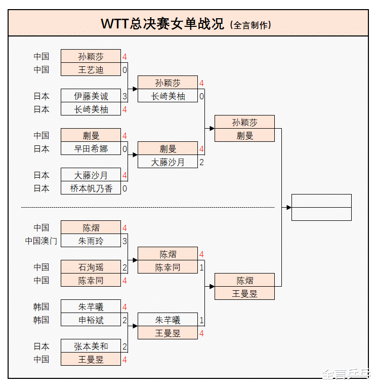 单打方面,女单4强还是全部出生,上半区国乒选手孙颖莎、蒯曼会师,下半区亦然两位中国队通顺员王曼昱、陈熠晋级,而她们的队友也没输外战,石洵瑶、王艺迪、陈幸同先后不敌陈幸同、王艺迪、陈熠而被淘汰,日韩选手拔本塞原输光,大多败给国乒队员。