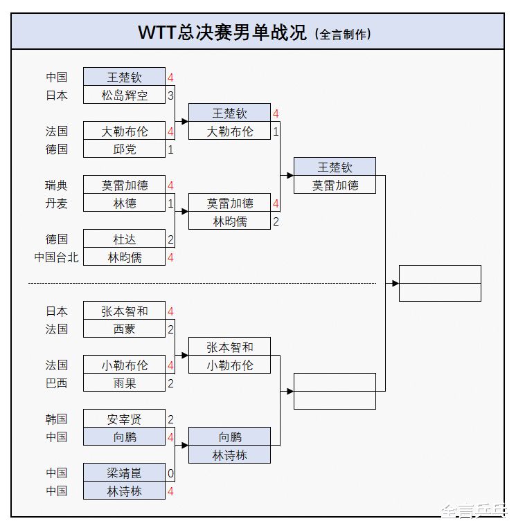 男单暂时只截止2场1/4决赛,上半区国乒选手王楚钦将再战瑞典主力莫雷加德,下半区两位中国小将林诗栋、向鹏爆发内战,日本的张本智和将对决法国的小勒布伦——单打最新战况如下: