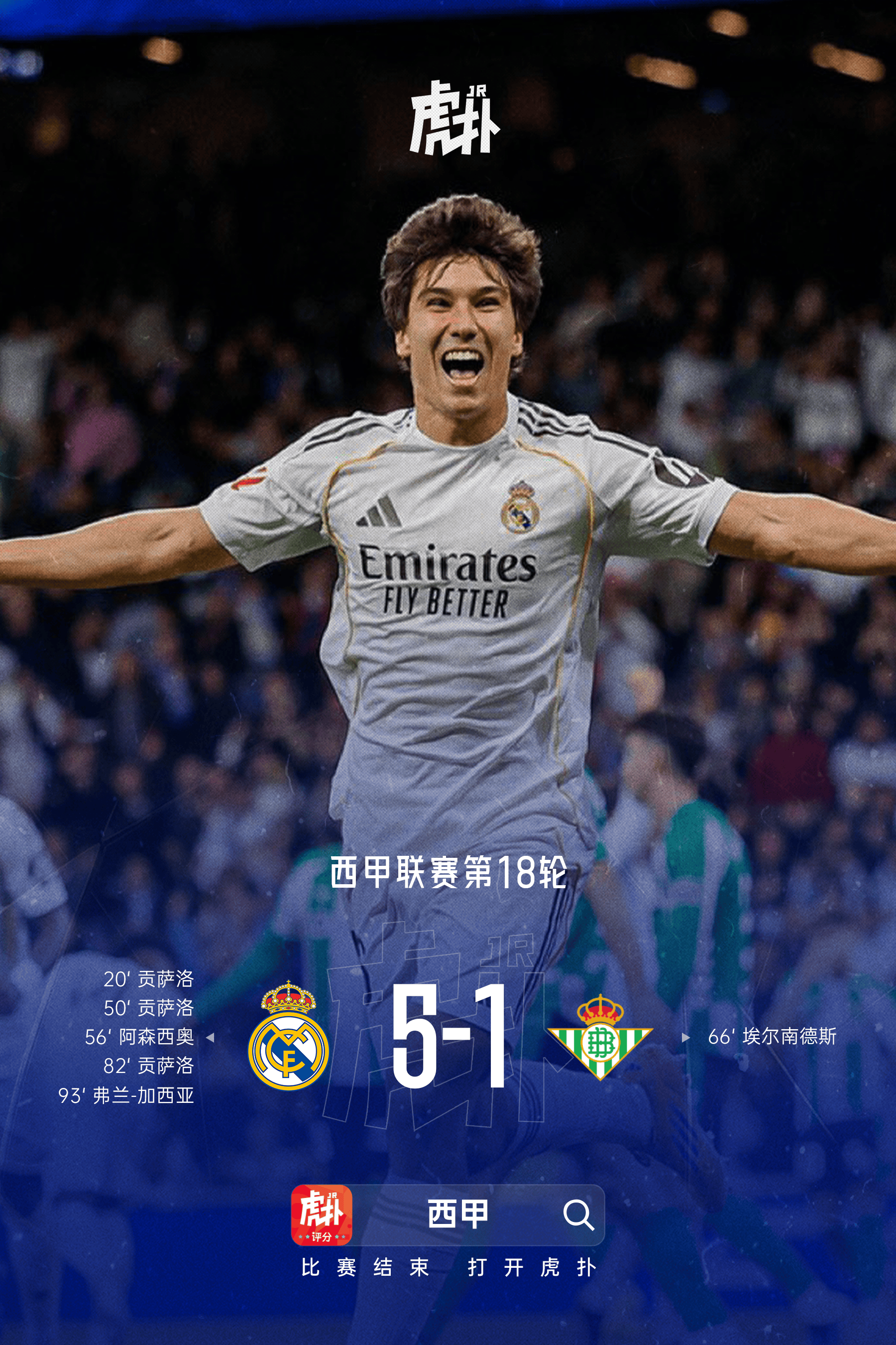 虎扑01月05日讯西甲第18轮,皇家马德里主场5-1大捷皇家贝蒂斯。