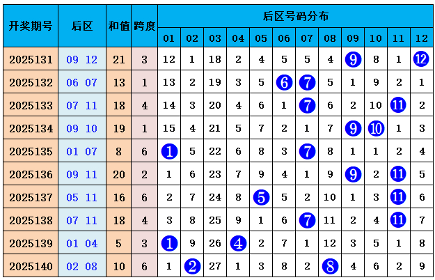 跨度分析:上期后区跨度为6,与前期比较上涨3个点位,展望本期跨度走势波动着落,保举两码跨度1--5