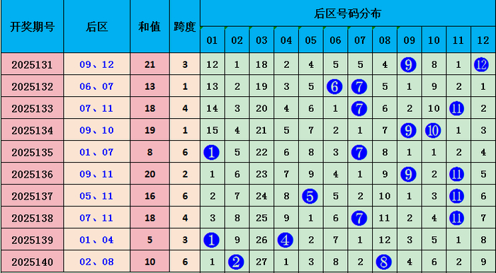 上期后区开出号码02 08,和值10,近十期和值21 13 18 19 8 20 16 18 5 10,和值波动领域较大,本期预测和值会下跌,重心照管号码:04 05,和值9 。