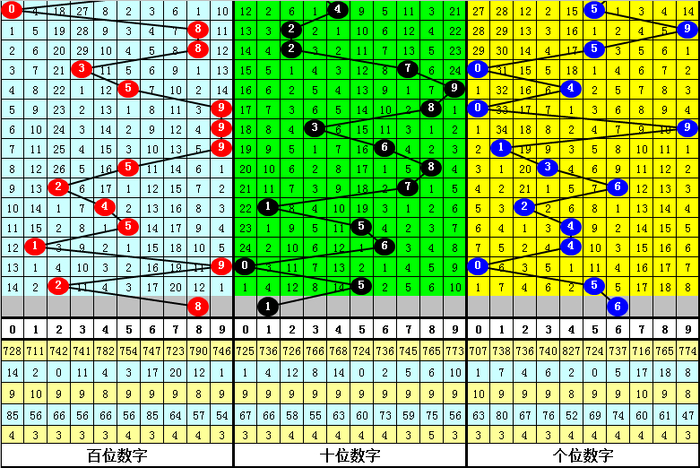 百位分析:该位上期奖号为2,出现2路、偶数、小 号,在前11期奖号,该位012路比为4:2:5,1路号码走冷,现在012路号码遗漏期数划分为1、2和0,近期百位防御2路号码走热。